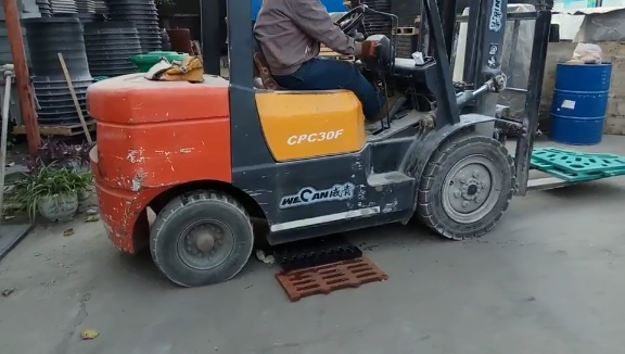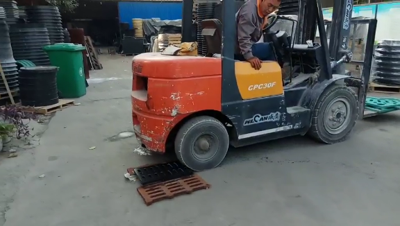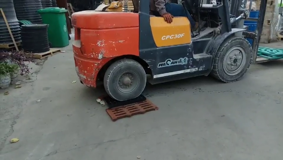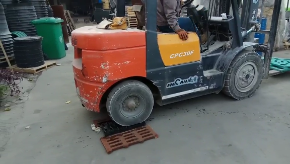 2、工人開(kāi)著自重4.2噸的叉車(chē)倒開(kāi)過(guò)去,在溝蓋板上面停留10秒左右。